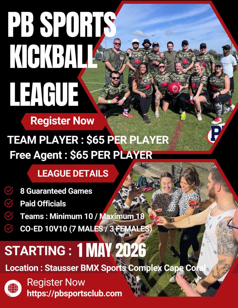 PB SPORTS KICKBALL LEAGUE Spring Season – [CAPE CORAL] League Info: 🚨There will be two…